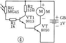 光电自动控制电路 见图4。VT1和VT2接成类似复合管电路形式,VT1的发射极电流也是VT2的基极电流,R2既是VT1的负载电阻器又是VT2的基极限流电阻器。因此,当VT1基极输入微弱的电流(0.1mA),可以控制末级VT2较强电流——驱动电动机运转电流(500mA)的变化。VT1选用小功率NPN型硅管9013,hfe≈200。同前计算方法,维持两管同时饱和导通时VT1基极偏置电阻器R1约为3.3kΩ,减去光敏电阻器RG亮阻2kΩ,限流电阻器R1实取1kΩ。光敏传感器也可以采用光敏二极管,使用时要注意极性,光敏二极管的负极接供电电源正极。光敏二极管对控制光线有方向性选择,且灵敏度较高,也不会产生强光照射后的疲劳现象。